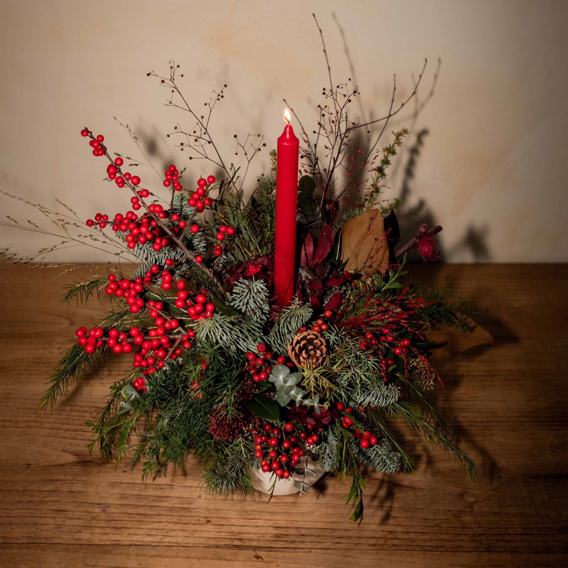 Este jarron navideño está elaborado artesanalmente con una cuidada selección de verdes naturales de temporada, combinados con bayas rojas, piñas y delicados elementos vegetales que aportan textura y movimiento a la composición. En el centro, una vela roja estilizada añade verticalidad y un punto de calidez, convirtiéndolo en el protagonista perfecto para la mesa.