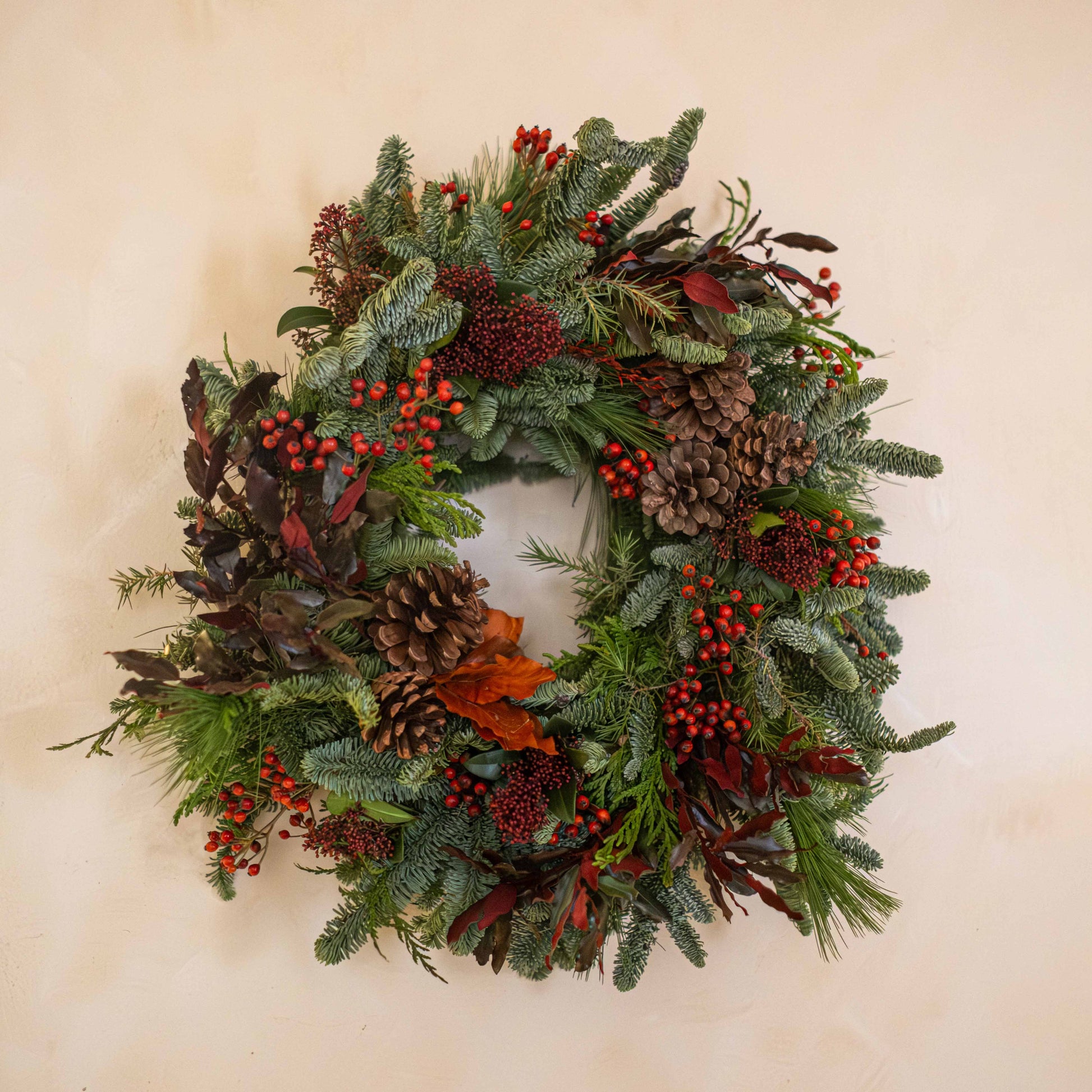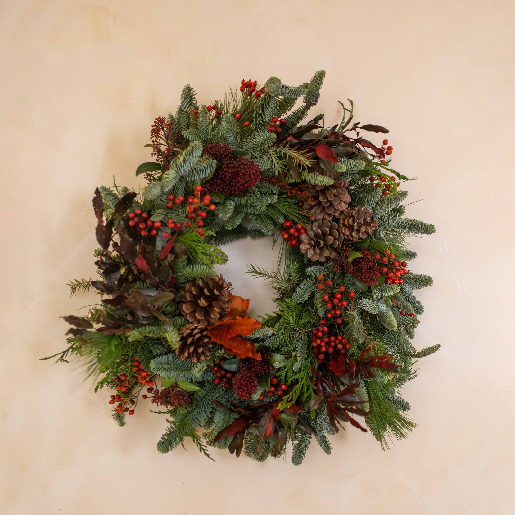 Esta corona de Adviento está elaborada artesanalmente con ramas naturales de abeto, creando una base frondosa y equilibrada que transmite calidez y tradición navideña. Personalizable en tonos verdes, rojos o dorados.