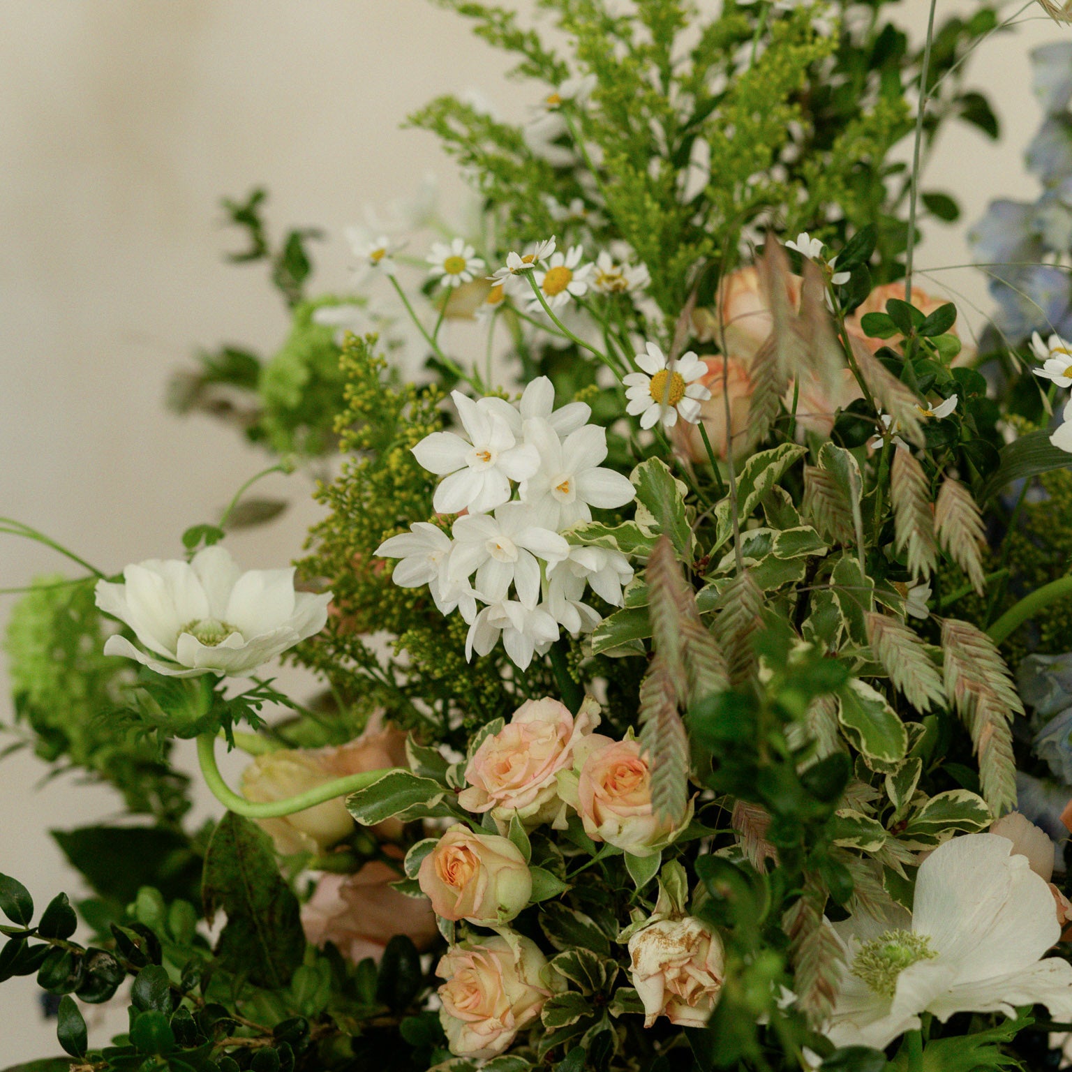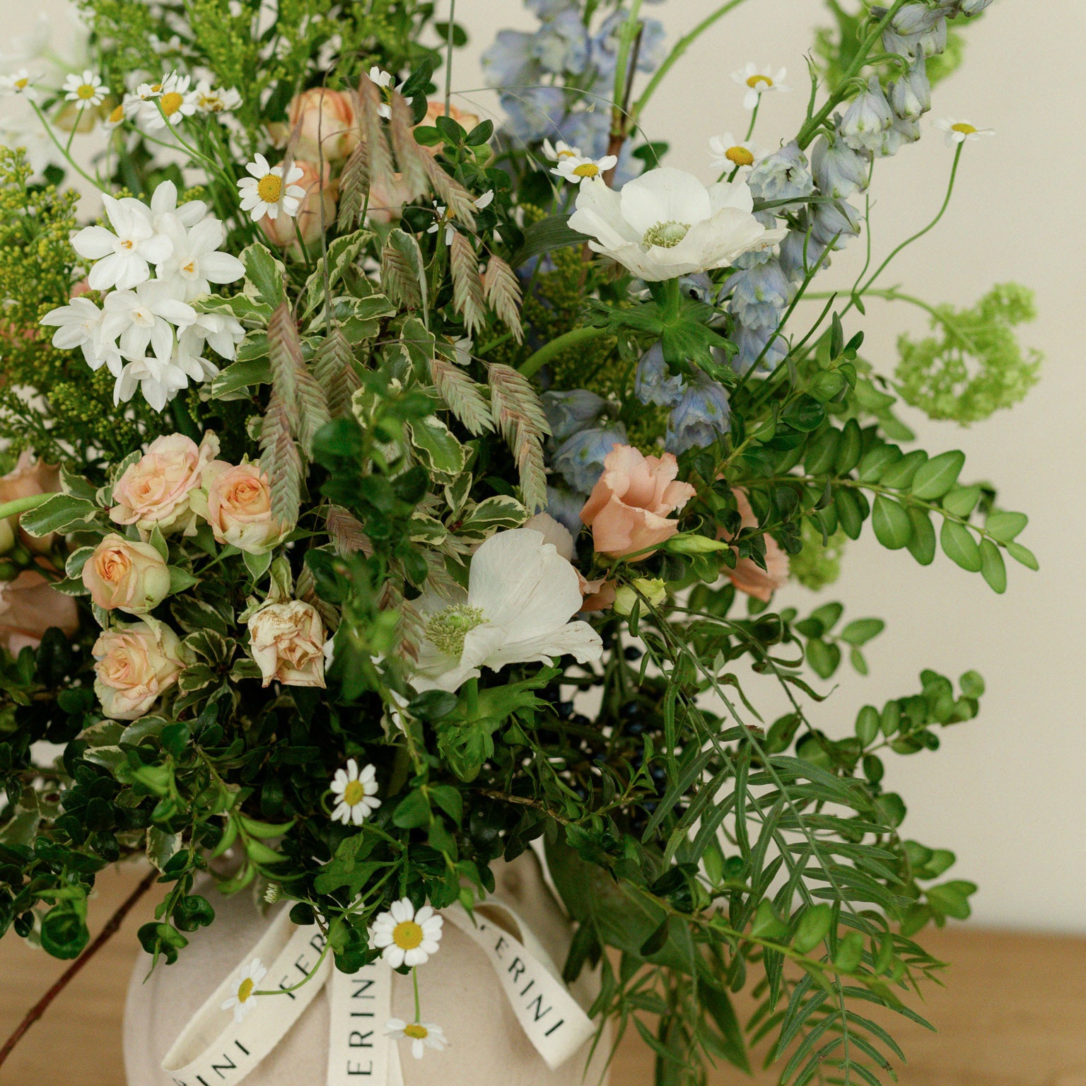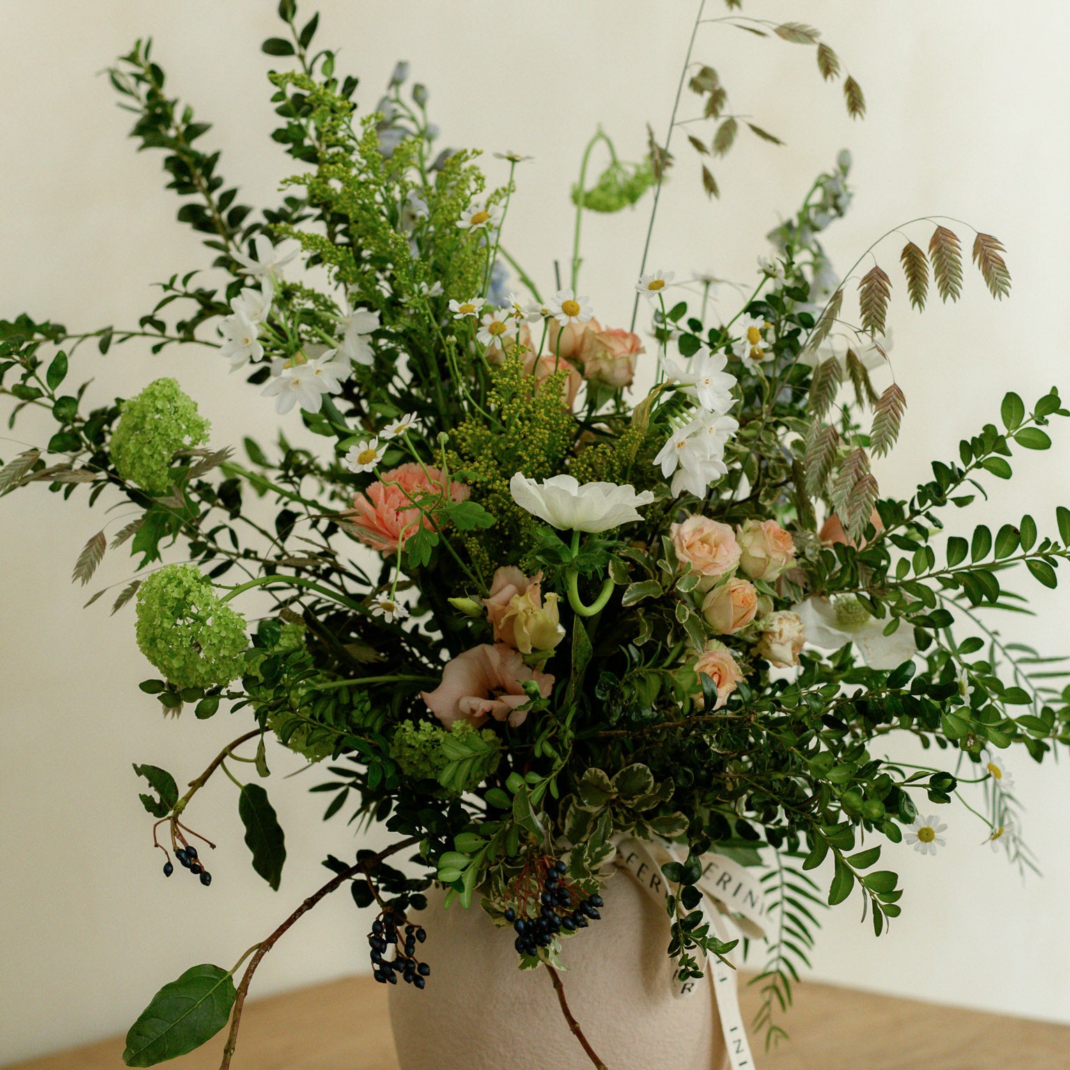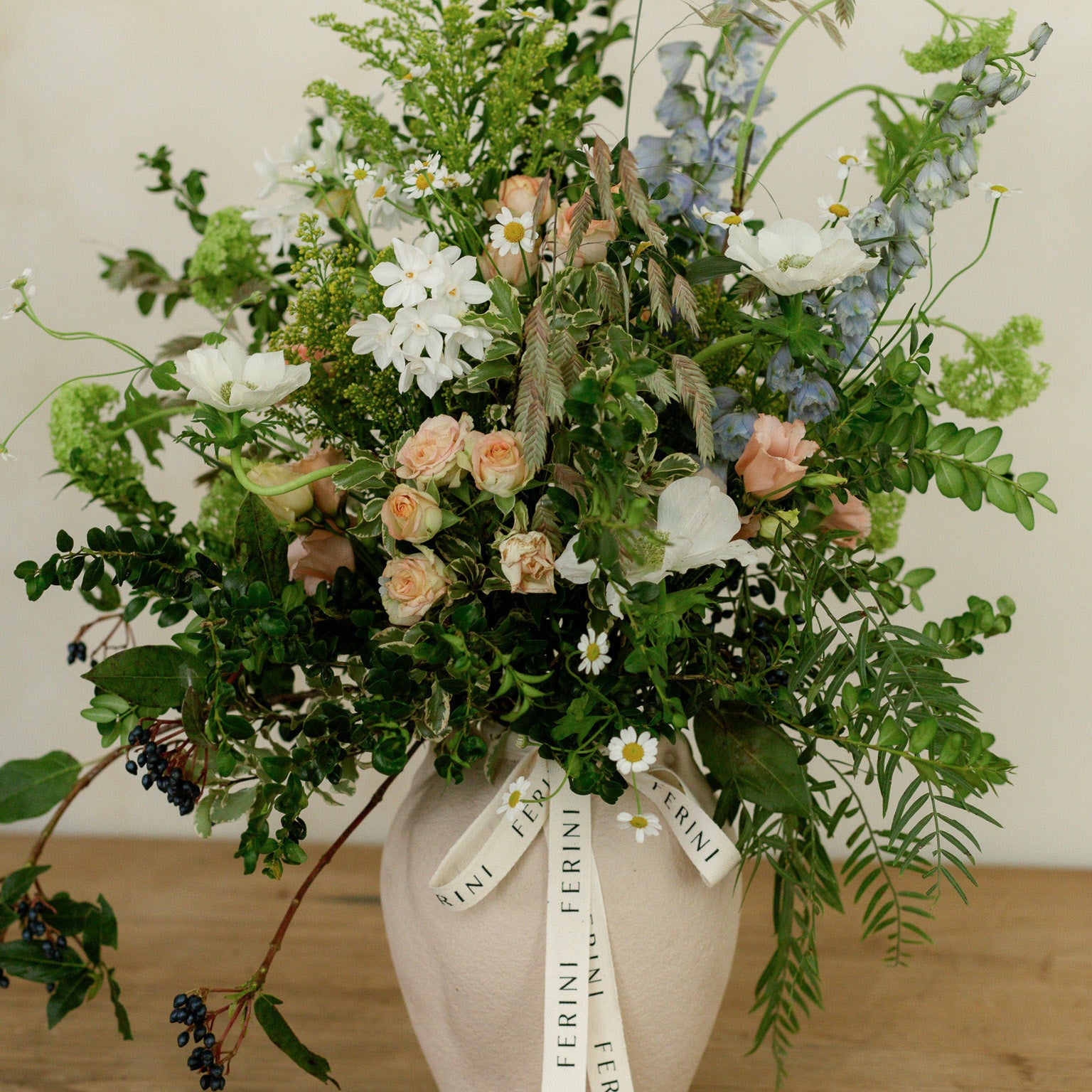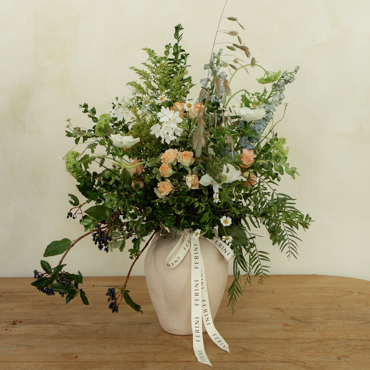 Diseño floral de inspiración silvestre en jarrón de cerámica mate. Predominan las flores en tonos blancos y crema como margaritas, rosas spray y lisianthus, combinadas con acentos verdes y texturas ligeras como solidago y follaje fresco. Destacan también elementos más etéreos como gramíneas y hojas de eucalipto. Un arreglo delicado, luminoso y muy versátil, perfecto para ambientes serenos y elegantes.