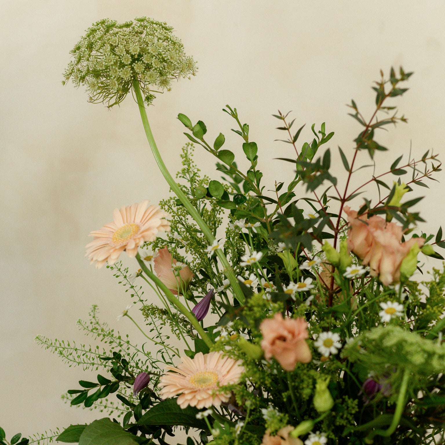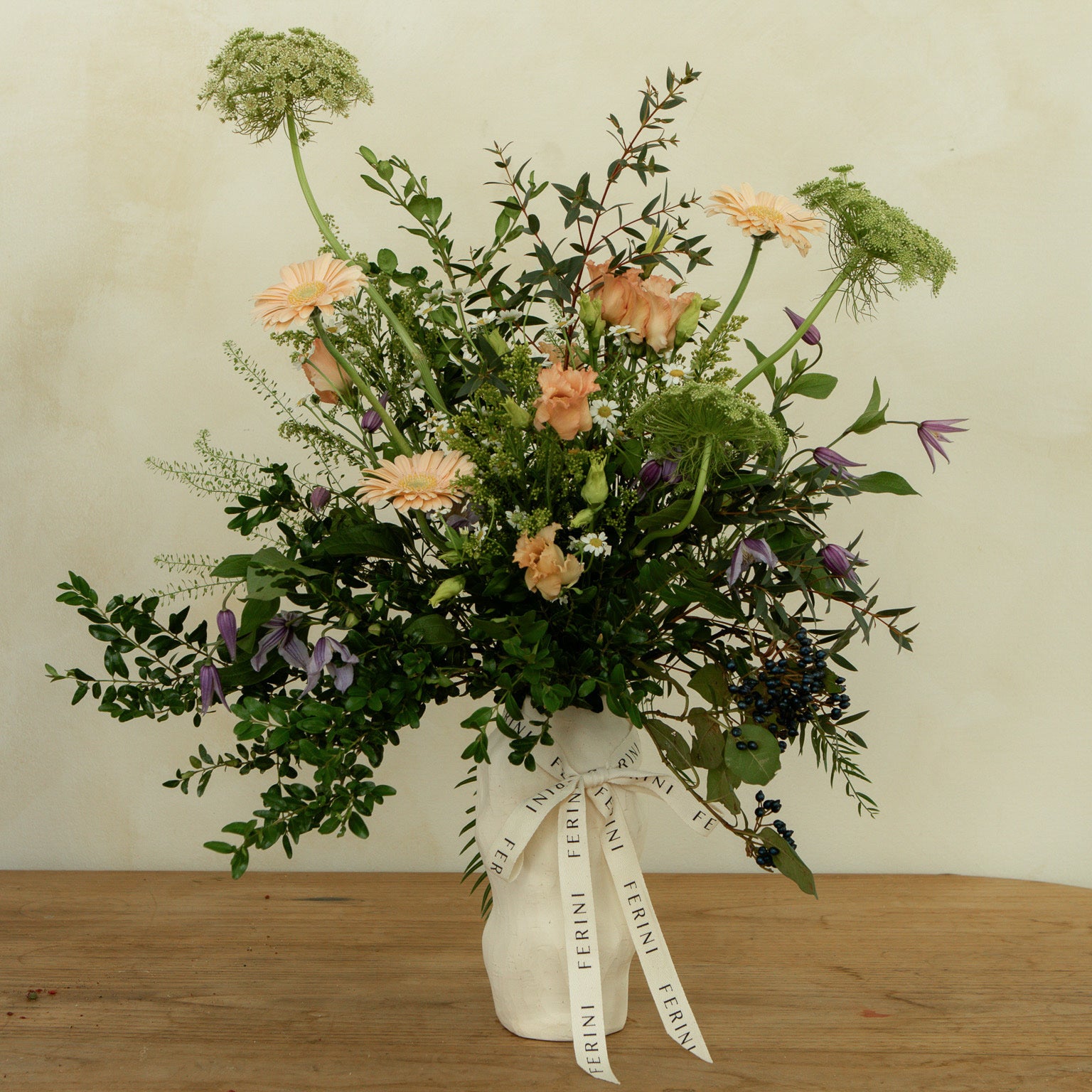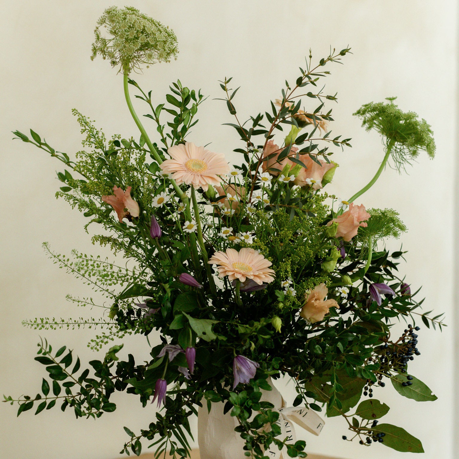 Este arreglo se presenta en un jarrón cerámico de líneas suaves, con una composición desenfadada y natural. Incluye gerberas en tonos melocotón, lisianthus y pequeñas flores tipo manzanilla, combinadas con umbelíferas y verdes silvestres. Las líneas abiertas y el movimiento de las flores aportan frescura y un aire campestre, ideal para espacios informales con estilo.